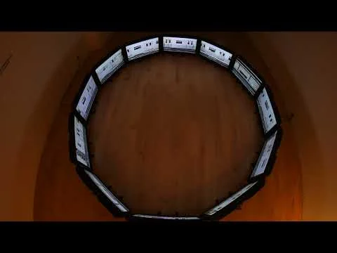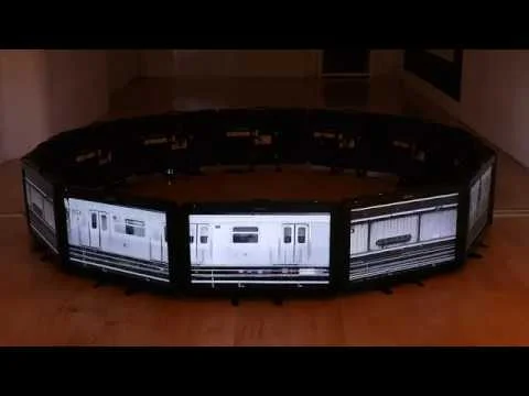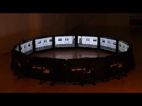 J 2 Manhattan - The Eternal Traveler Syndrome in a Circular Motion (Out) is an installation of 12 flat TV screens facing outside the circle featuring a constant circular motion of arriving and departing trains. It resembles an eternal traveler caught in a never-ending routine journey like the artist himself. Watch the video bellow: