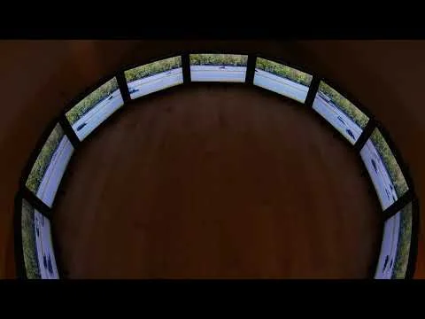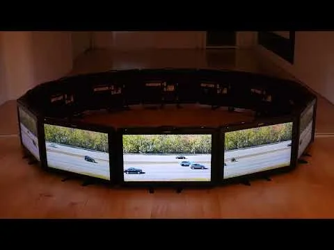 Interstate 87 - The Eternal Traveler Syndrome in a Circular Motion (Out) is an installation of 12 flat TV screens facing outside the circle featuring a constant circular motion of passing cars on a highway in a never-ending routine journey like the artist himself. Watch the video bellow: